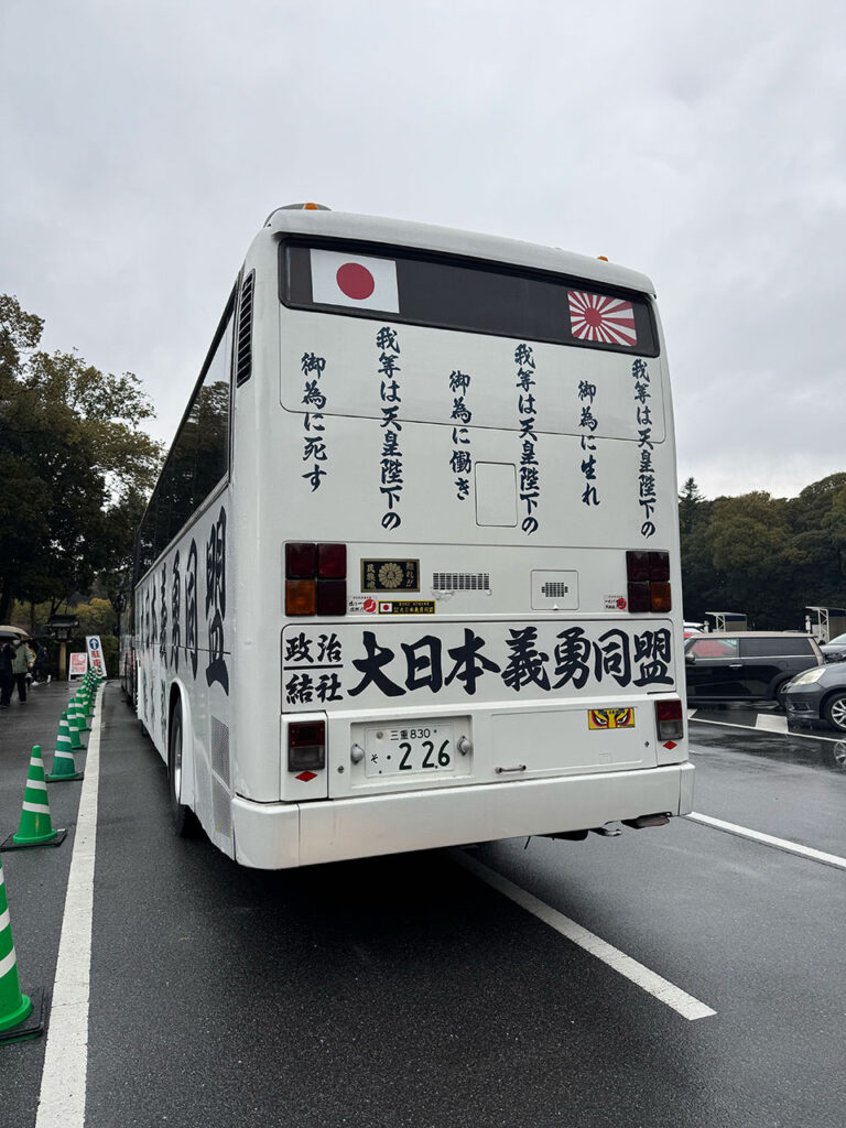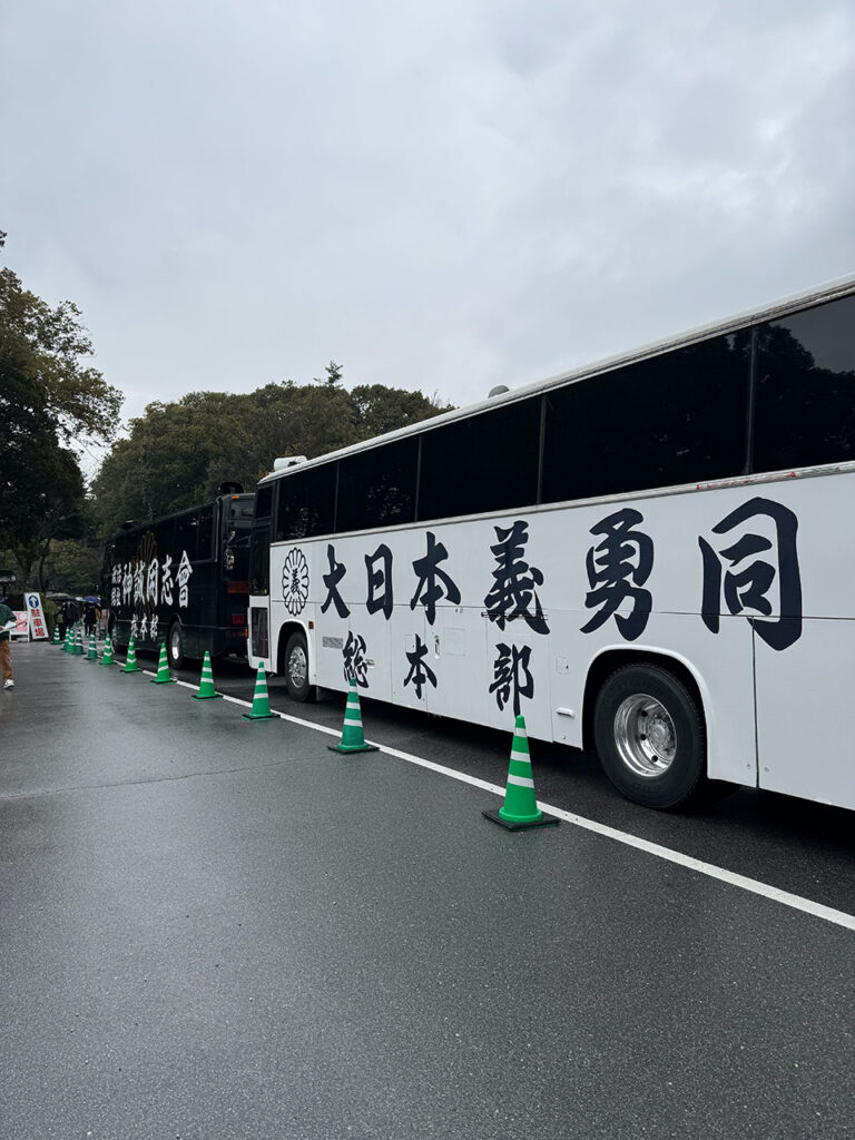 境内や周辺には街宣車も多く、独特な雰囲気もあった。大日本義勇同のバスなんかはじめて見た。いろんな立場や考えの人が同じ場所に集まるのも、この日ならではかもしれない。
