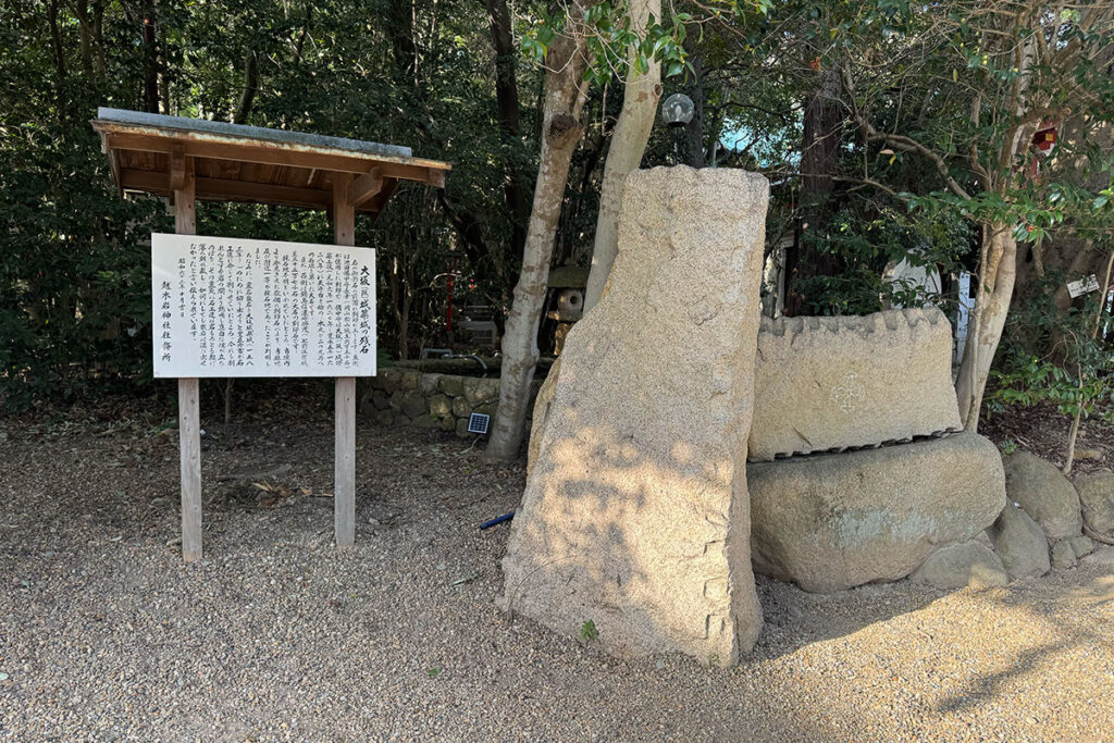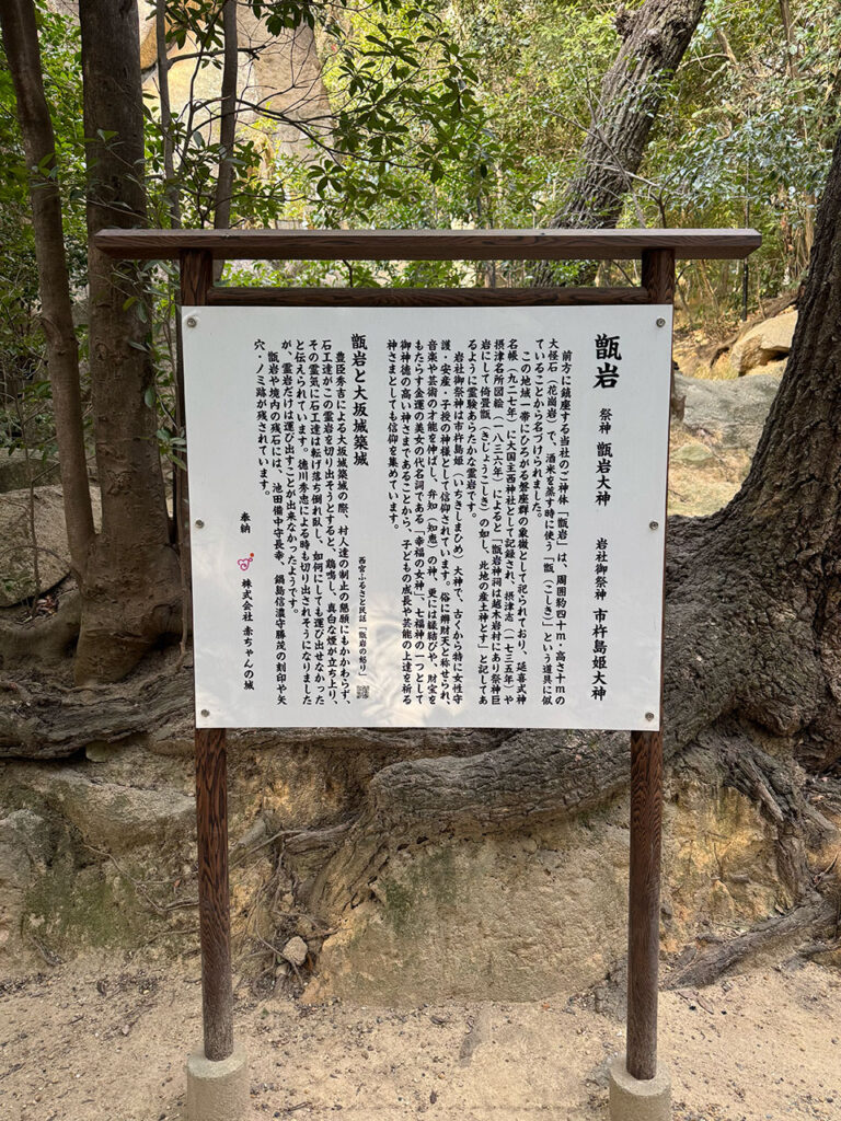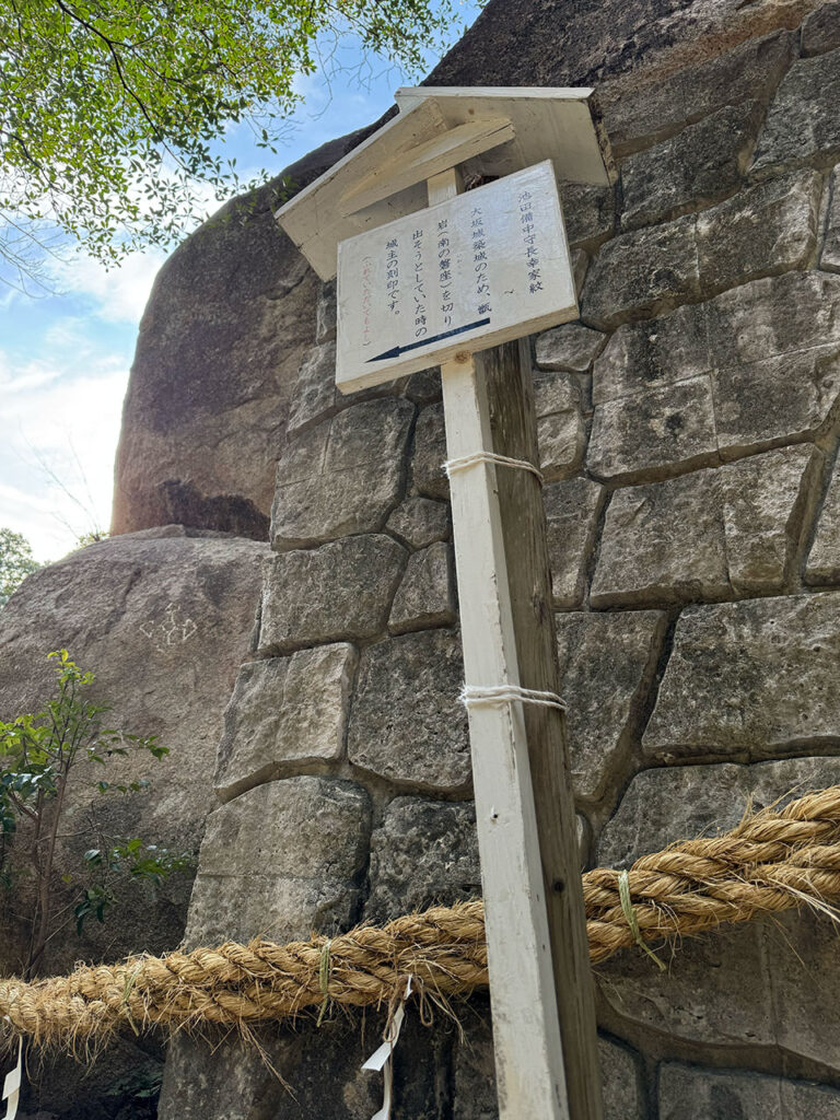 もう1つ、この甑岩の面白い伝説が書かれていた。大阪城を築くとき、当時の有力者たちは良い石材を集めるために各地の石を探して回った。甑岩もその候補に挙がり、岩を切り出して大阪城の石垣に使おうとしたそうだ。