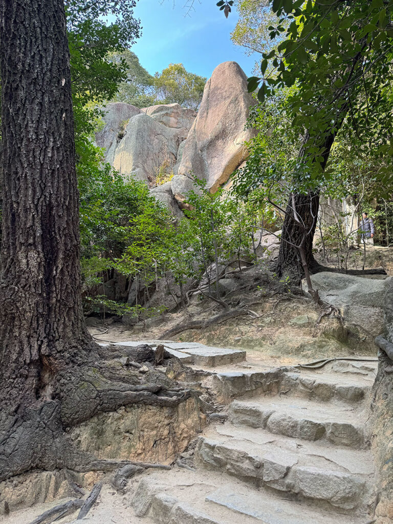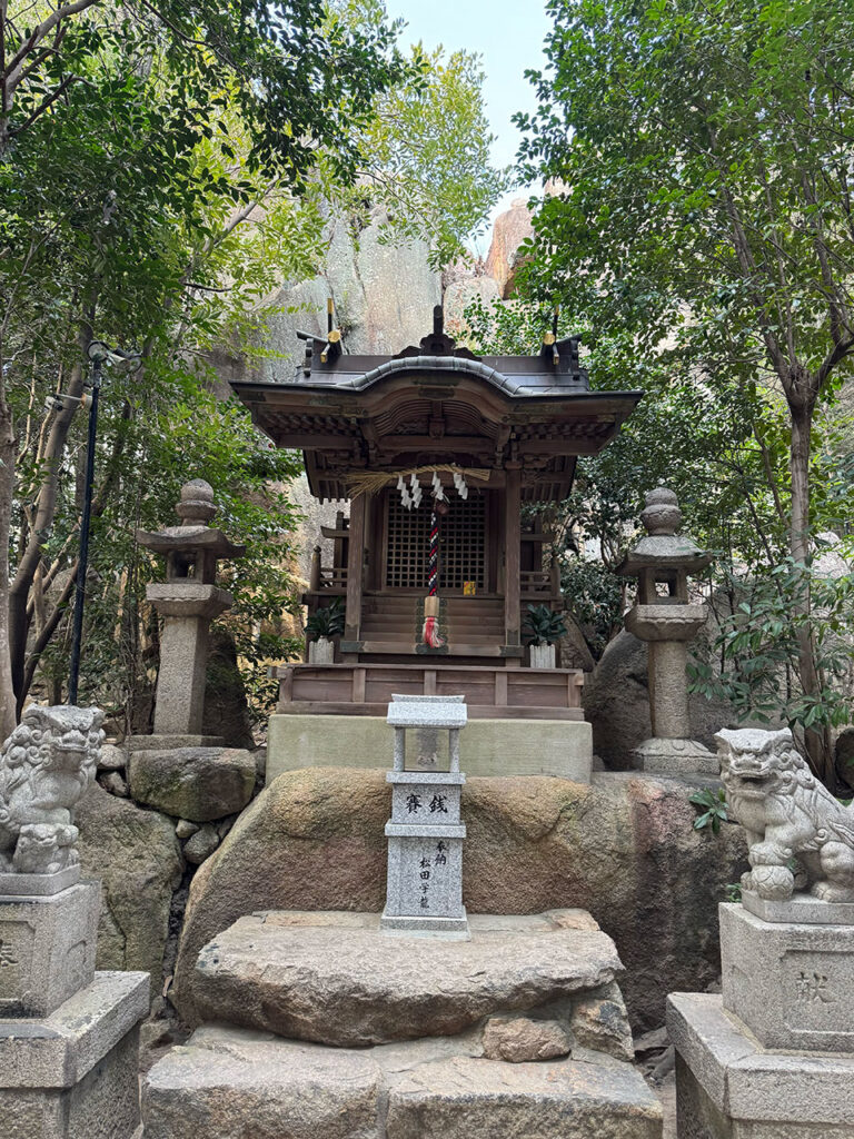 本殿の奥に進むと、緩やかな山道が続き、越木岩神社のご神体「甑岩(こしきいわ)」が現れる。高さ約10~12メートル、周囲約40メートルもある大きな岩。「岩を祀っている」というより、「岩の前に、神社が後から作られた」感じ。沖縄の斎場御嶽みたい。日本に古くからある自然崇拝(精霊崇拝・アニミズム)って通じるものがあると思う。