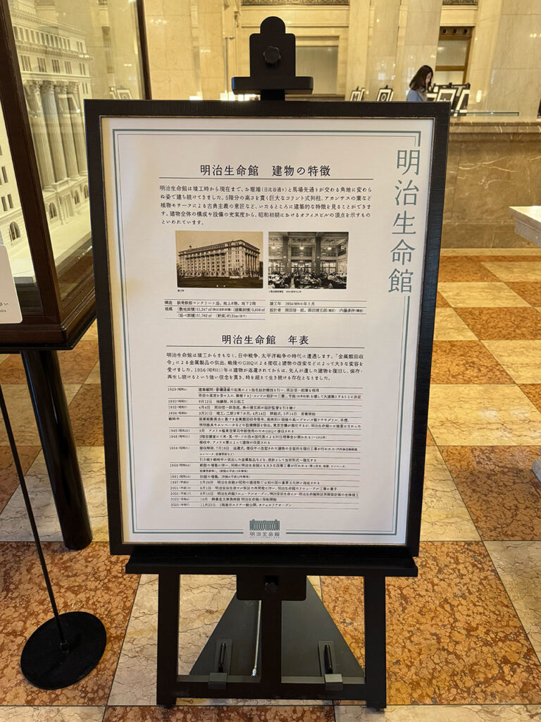建築模型や映像展示、歴史背景を知る資料もありました。正直な感想としては、「食堂や会議室もゴージャスで保健室まであって、1934年にこんなビルを作れた保険会社。めちゃくちゃ儲かったんだなあ…」と思った(笑)。無料で見学できるので、丸の内散策のついでにも気軽に立ち寄れます。