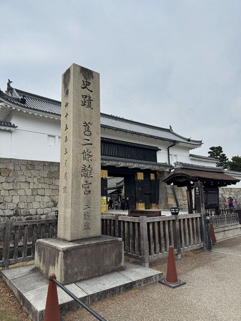 当時の京都の城は伏見城でした。二条城は京都御所の守護と、将軍が来たときの宿泊所として築かれたので、戦うための城ではなく、迎賓館のような政治の城だったようです。天守閣は落雷で失われ、跡地だけ残っています。江戸時代築の城なので石垣も立派。