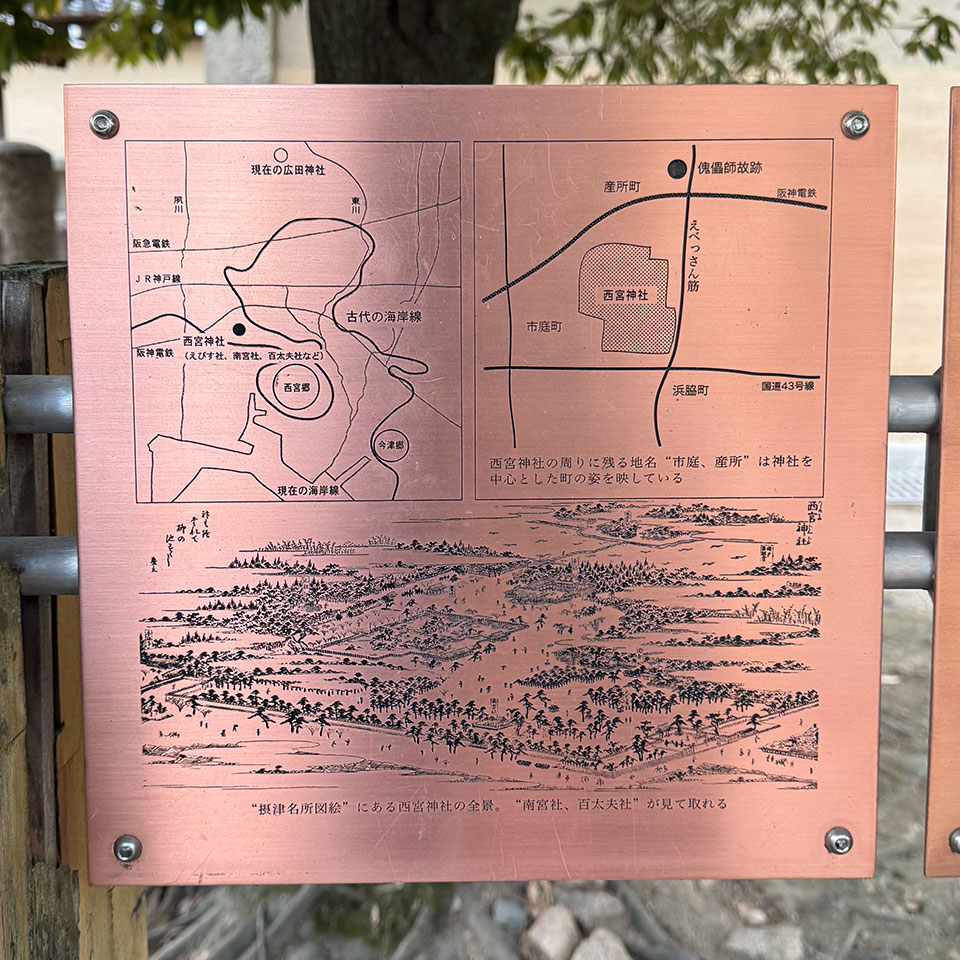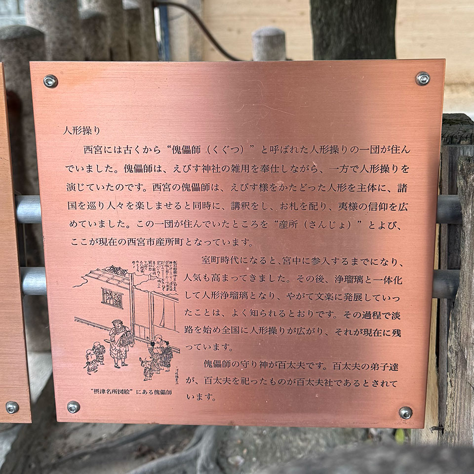 産所町は、かつて傀儡師(くぐつし)と呼ばれる人形操りの人々が住んでいたそうです。えびすさまをかたどった人形を携えて各地を巡り、芸とともにえびす信仰を広めた一団の拠点だったという。西宮神社の境内にある百太夫神社は、その傀儡師たちの祖を祀る社。