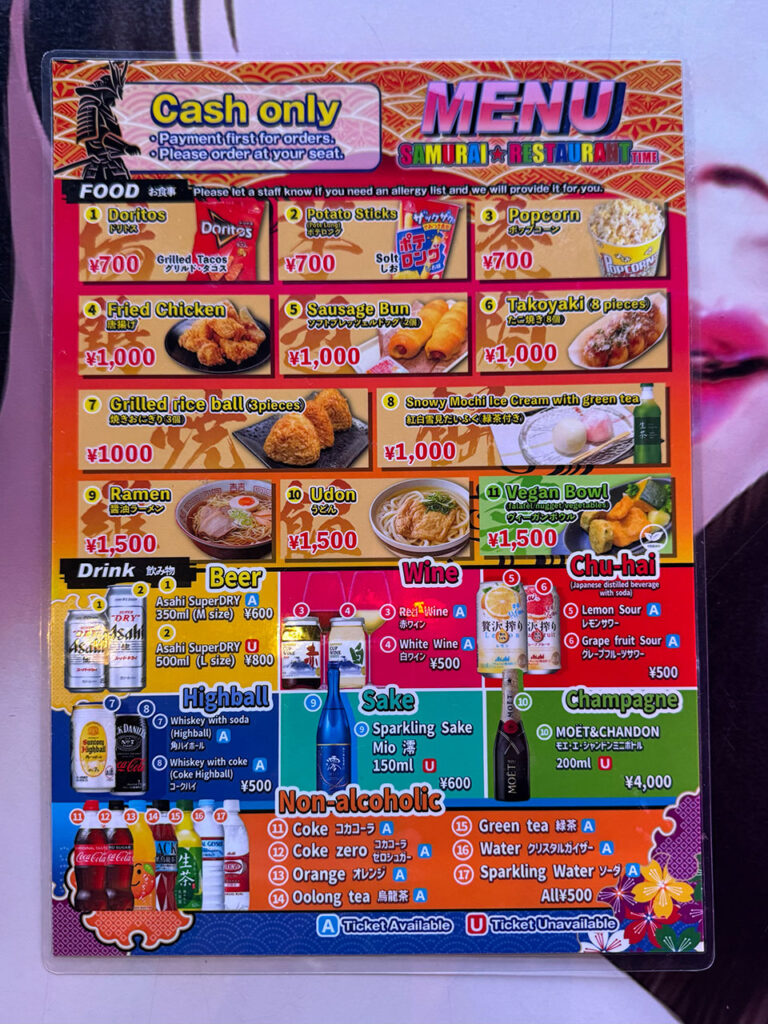 追加メニューは現金払いのみ。値段設定は高め。そういえば、入場するときになぜか身分証明がコピーされます。なぜ?