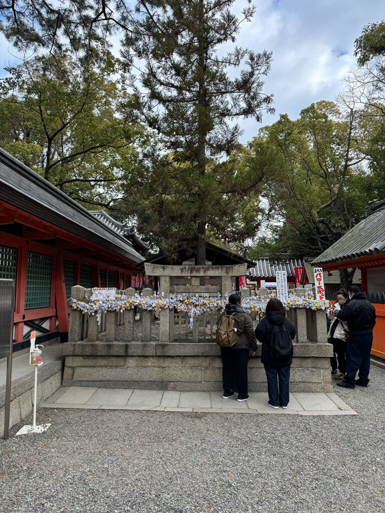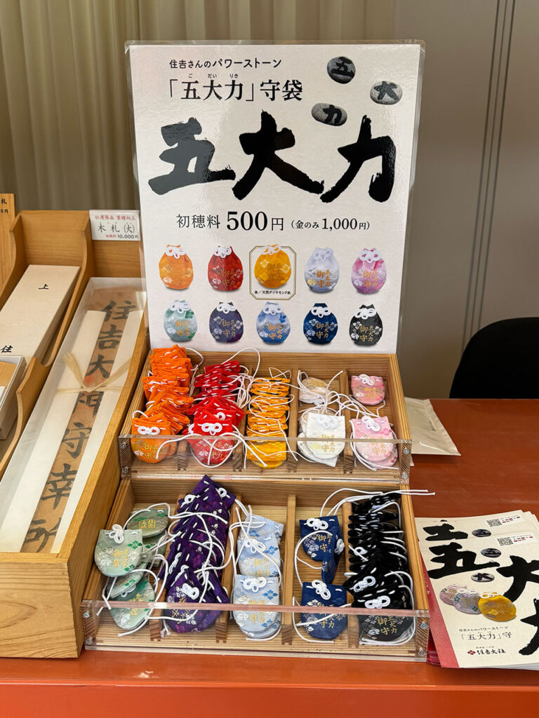 自分で探して拾った3つの石を、授与所で買った専用のお守り袋(五大力守袋)に入れてお守りにする。願いが叶ったら、拾った小石と同じ数だけ自分で「五・大・力」と書いた新しい石を用意して、元の「五所御前」の玉砂利に返すのが習わしになっている。大阪って商売が好きだなあと思った。